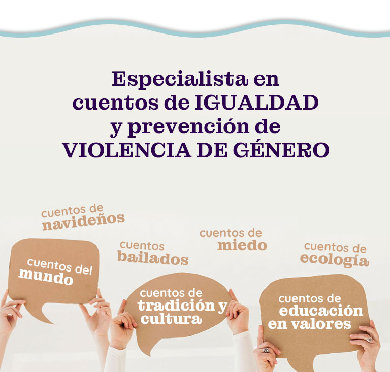 Cuentacuentos, actriz, narradora oral y dinamizadora social especializada en PROYECTOS DE IGUALDAD creados y diseñados metodológica y didácticamente para trabajar la COEDUCACIÓN y prevenir la violencia de género en ámbitos educativos, entidades locales, ONGs, etc.